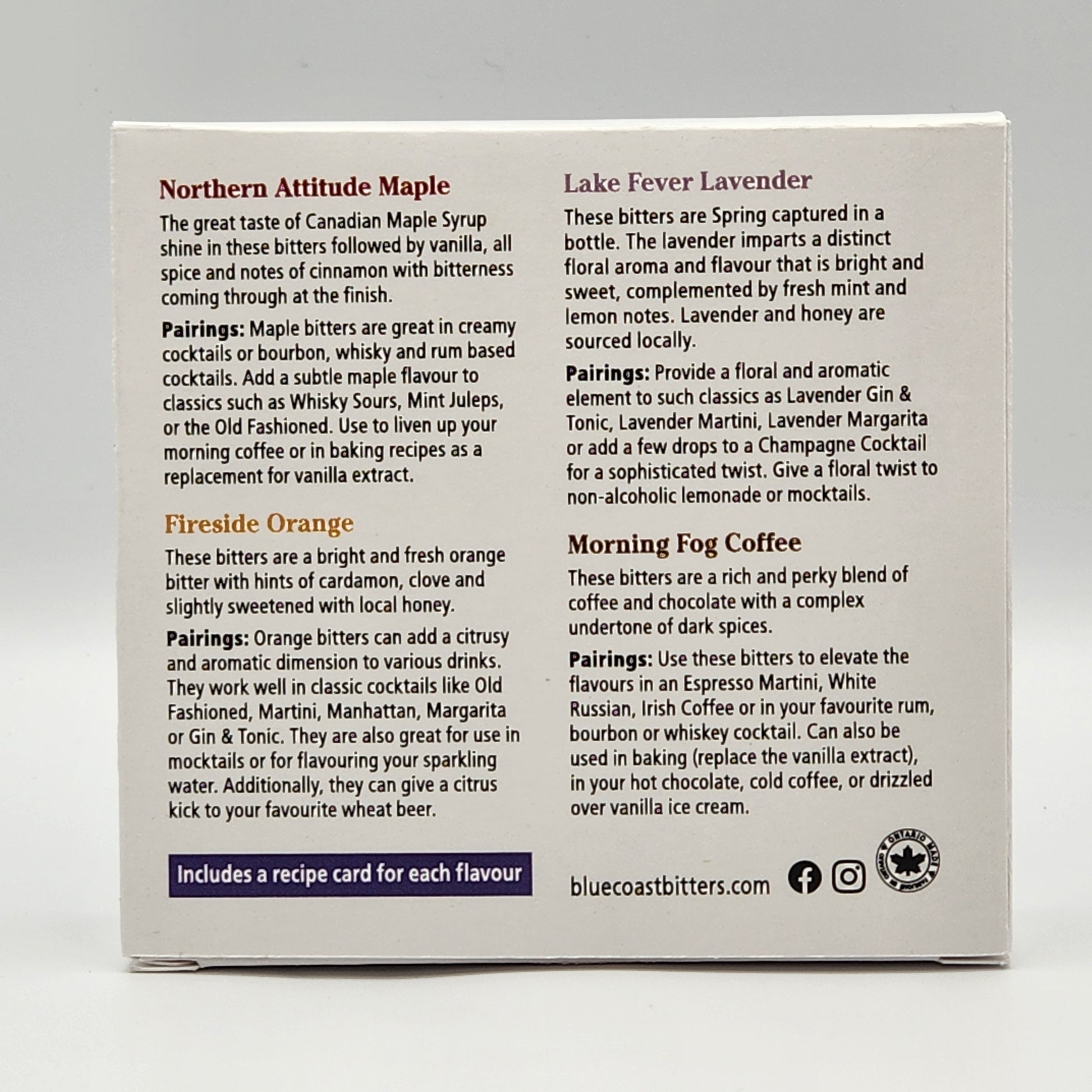 The Blue Coast Bitters Sample Pack features four of our most popular handcrafted bitters in 15ml bottles and is great for gift giving or for introducing yourself to the world of cocktail bitters. All our bitters are made from all natural ingredients and do not contain any artificial flavours or sweeteners. Use to add flavour, depth and complexity to cocktails, mocktails, tea, coffee and sparkling water. Blue Coast Bitters can also enhance vinaigrettes, marinades and baked goods.
